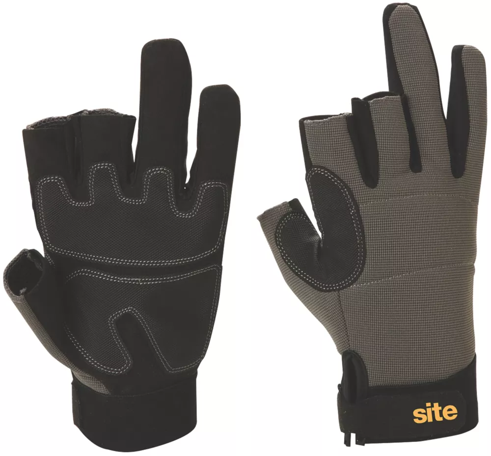 Durable 3-finger gloves with padded gripper palm and knuckle protection. Partially fingerless design for increased dexterity.