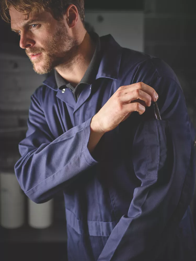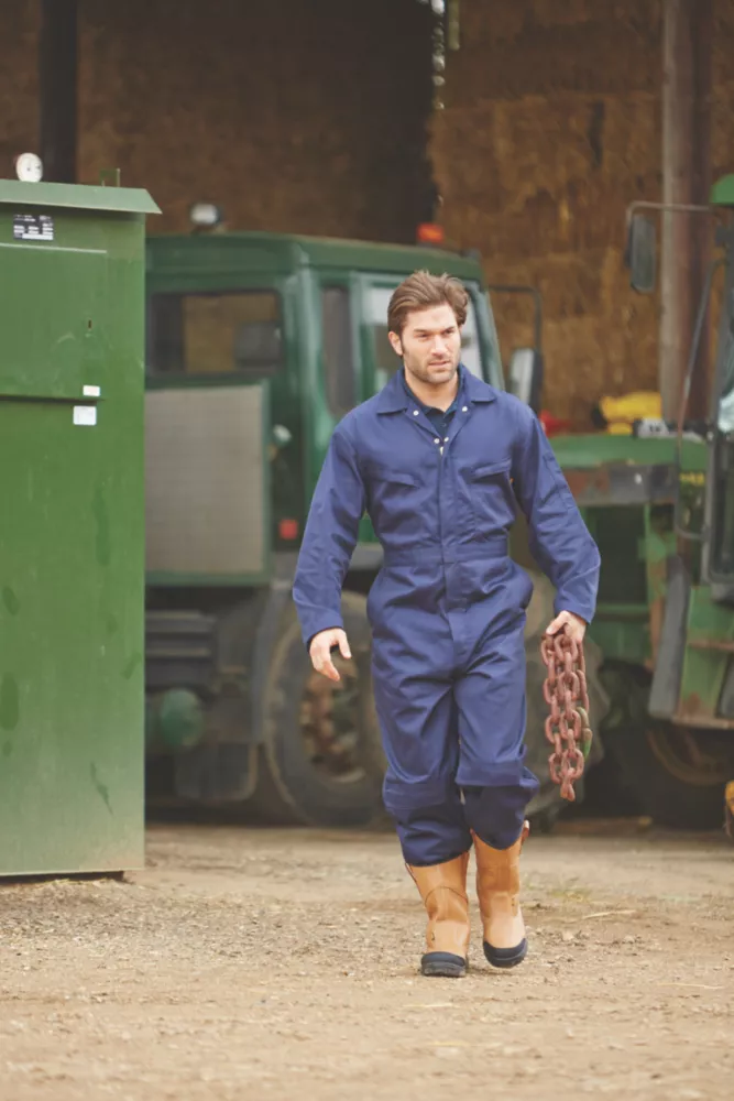 2-way zip-front coverall. Adjustable elasticated waistband and top-loading knee pad pockets. 240g/m².