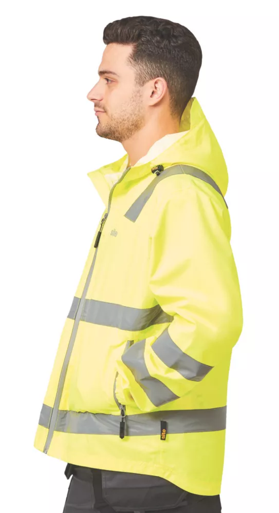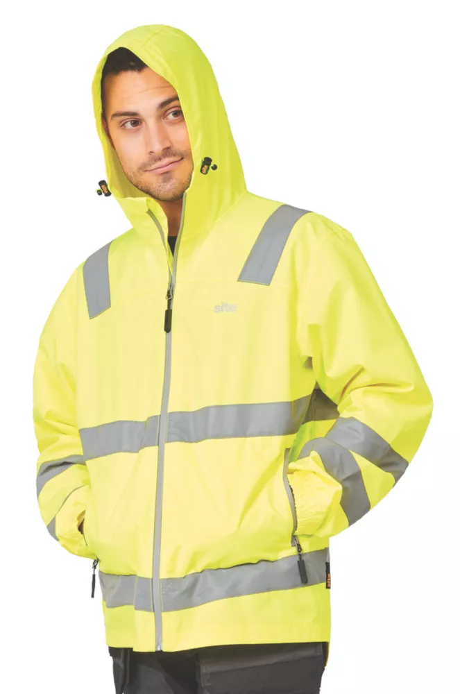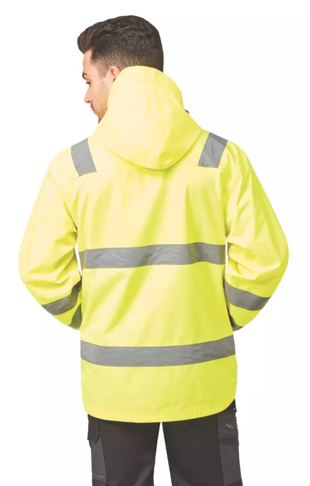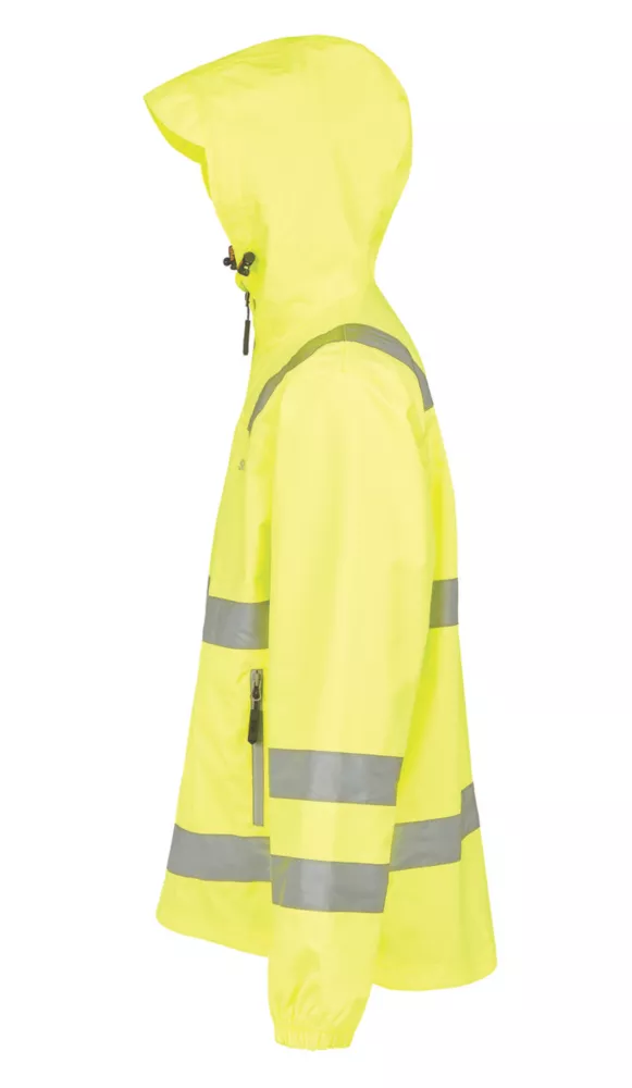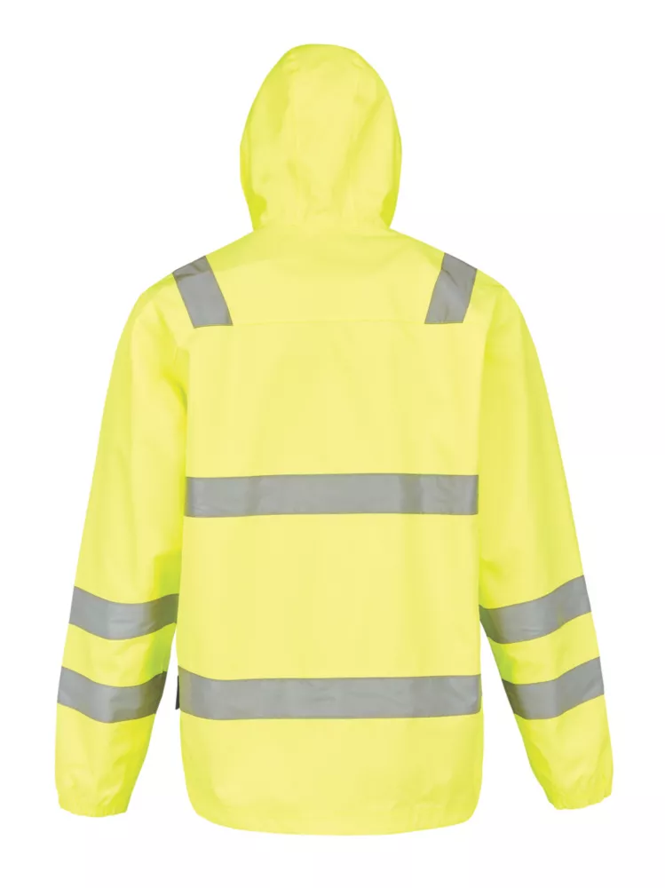 Modern, high visibility waterproof lightweight jacket with reflective tape. Features elasticated cuffs and waterproof zip pockets. 190g/m².