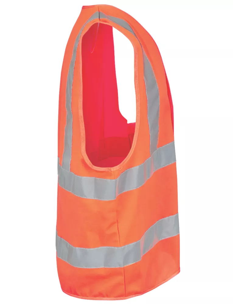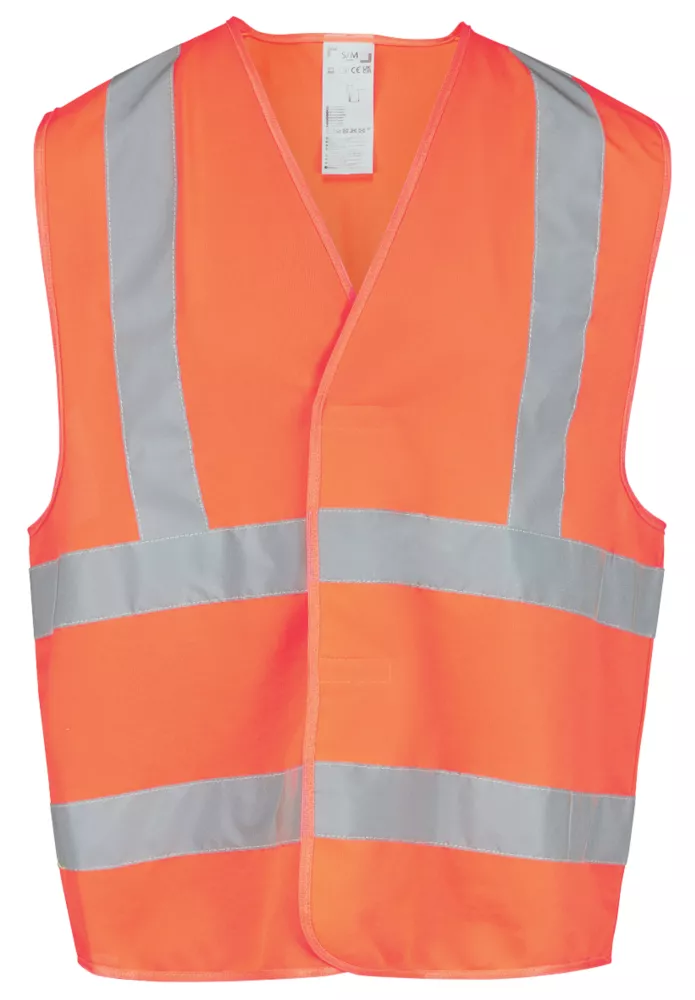 Hi-vis waistcoat with hook and loop fastening and reflective tape.