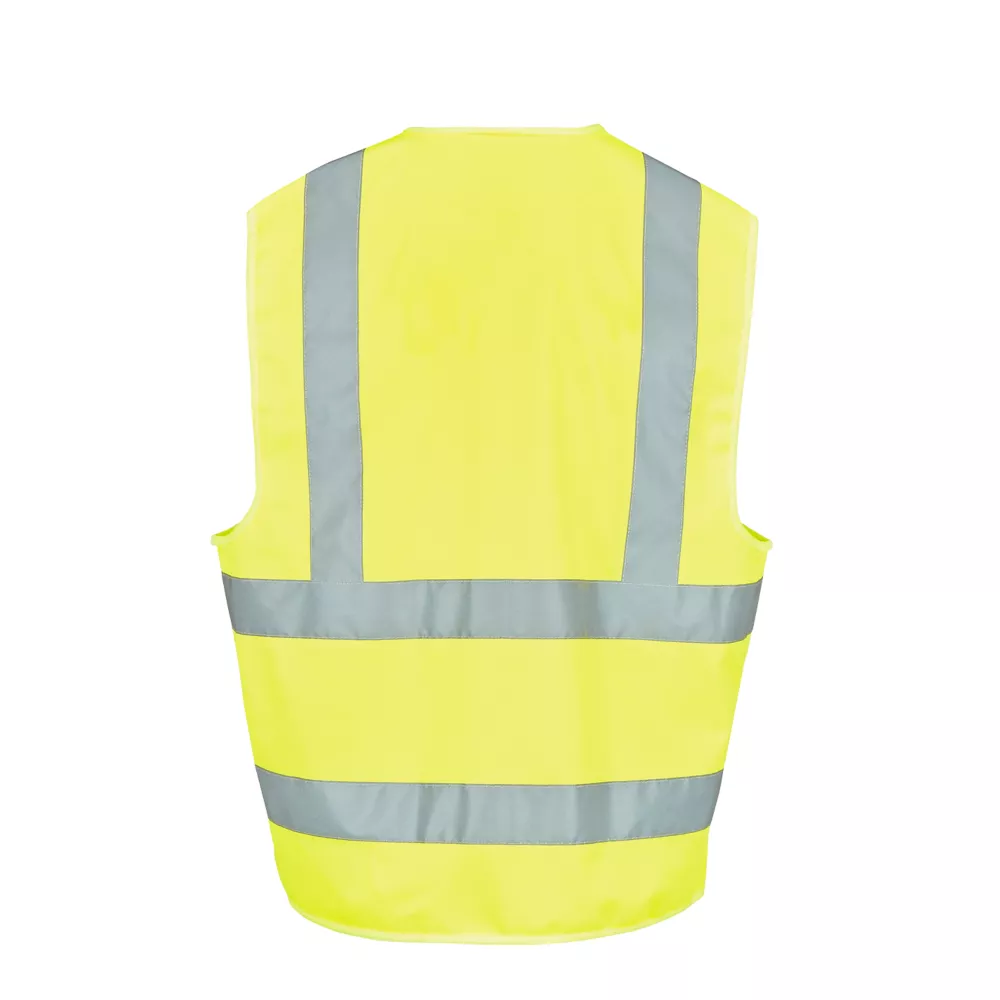 Hi-vis waistcoat with hook and loop fastening and reflective tape.
