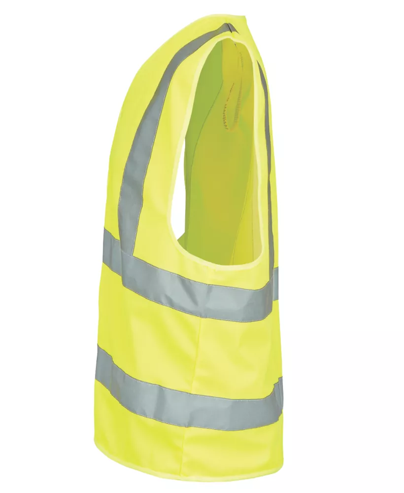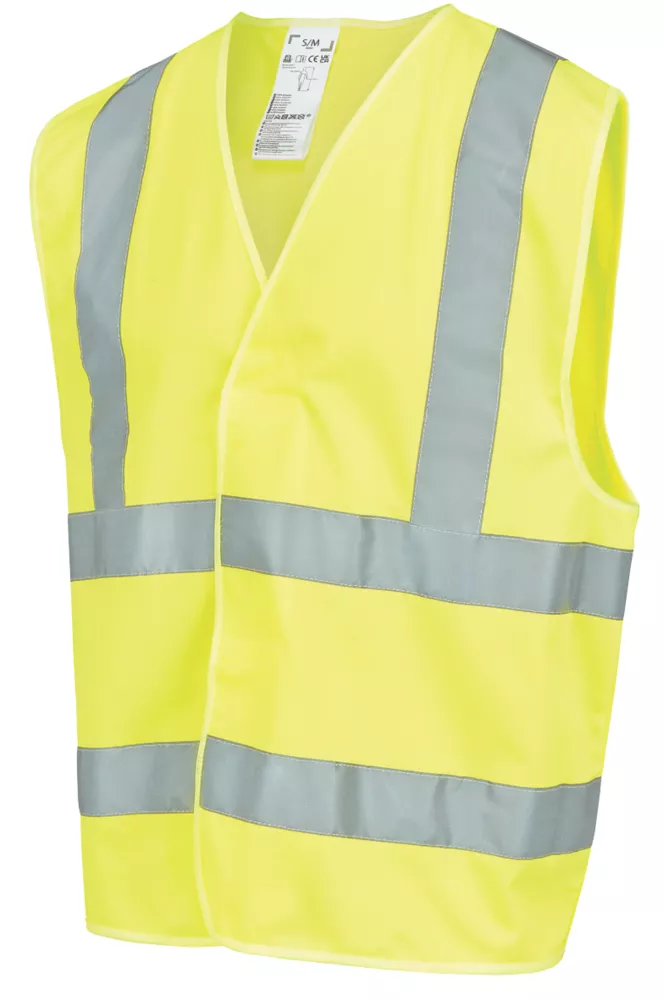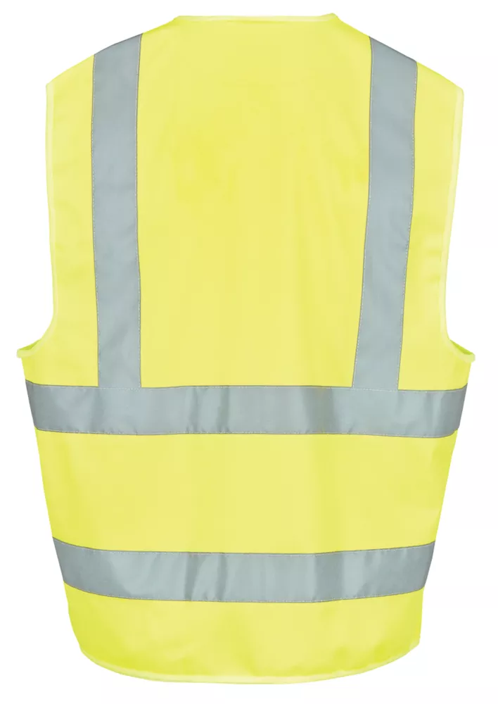 Hi-vis waistcoat with hook and loop fastening and reflective tape.